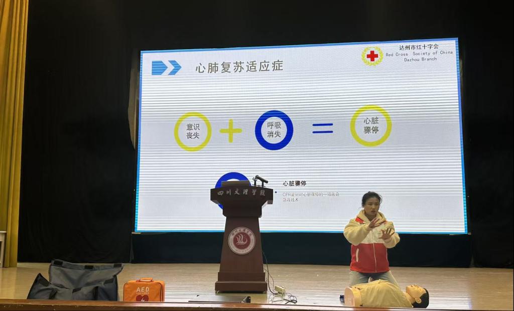 现场还邀请了达州市红十字应急救护志愿服务队队长、中国红十字应急救护师资王文静老师为同学们讲授心肺复苏、创伤包扎等急救技能,生动的实操演示激发了大家浓厚的学习兴趣。许多学生在了解“三献”意义后,当场登记成为造血干细胞捐献志愿者。
